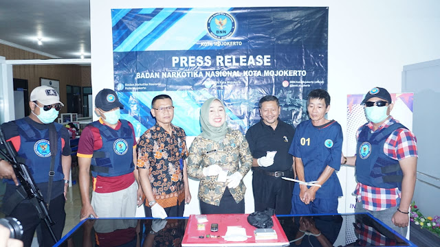 Kepala BNN Kota Mojokerto, AKBP Suharsi saat pers rilis di kantor BNN Kota Mojokerto, Jumat (28/6) mengatakan jika penggerebekan kedua pelaku pada pukul 18.00 WIB saat keduanya melintas di jalan raya di kelurahan Wates Kota Mojokerto usai pulang dari mengambil barang di wilayah Surabaya.
