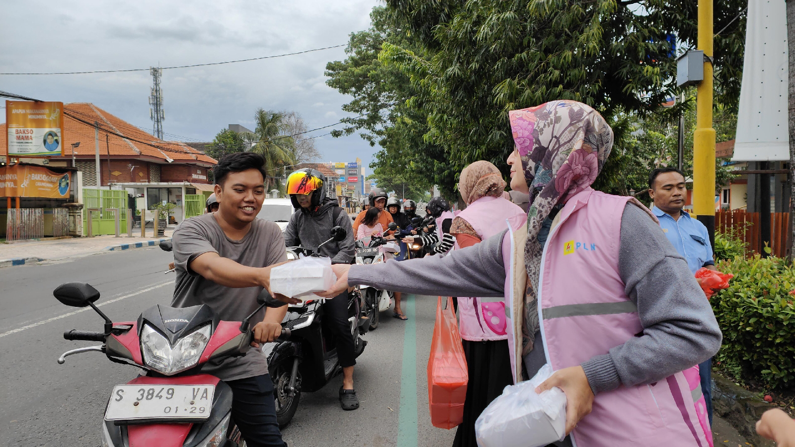 Disambut antusias, para pengendara jalan yang melintasi kantor PLN UP3 Mojokerto sabar mengantri dengan tertib pembagian takjil tersebut.